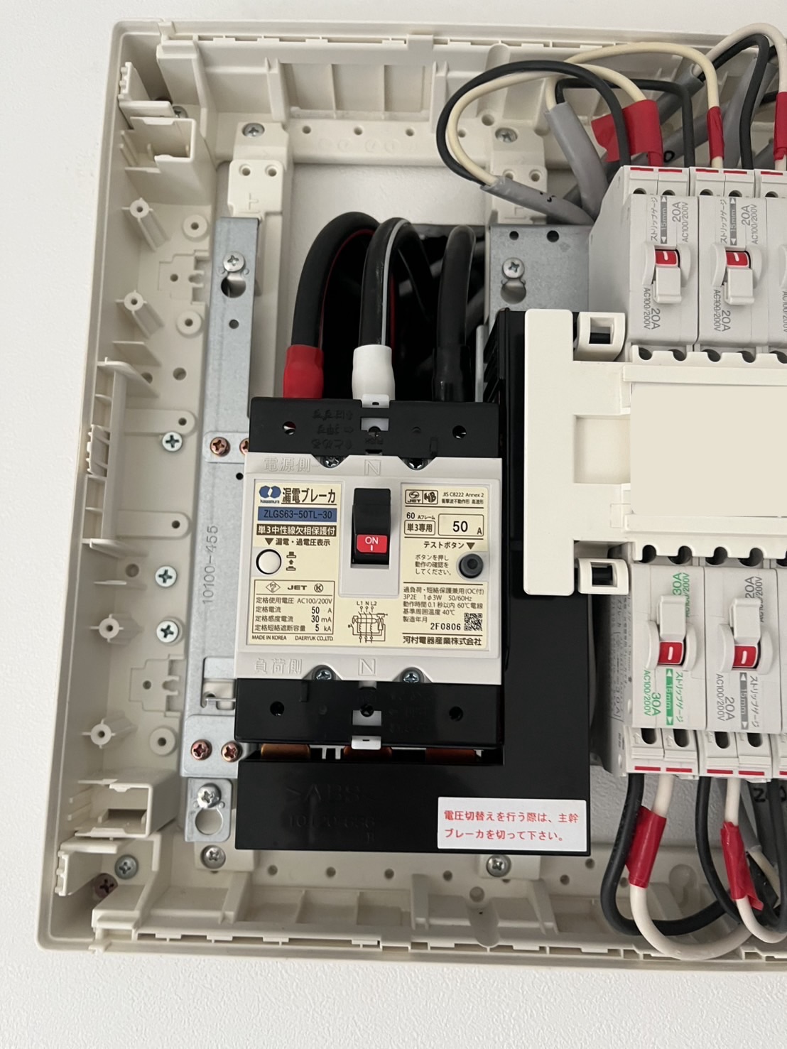 今回も写真左の漏電ブレーカーを容量に合ったものに交換しました。